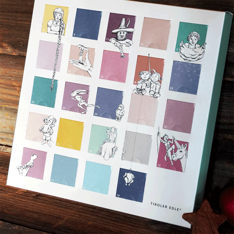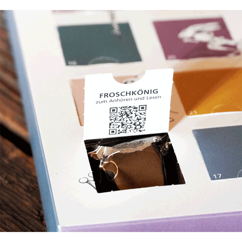 In diesem Schokoladen Adventskalender sind 24 handgemachte Pralinen versteckt und dazu QR-Codes mit Links zu taditionellen Märchen zum Vorlesen oder Anhören